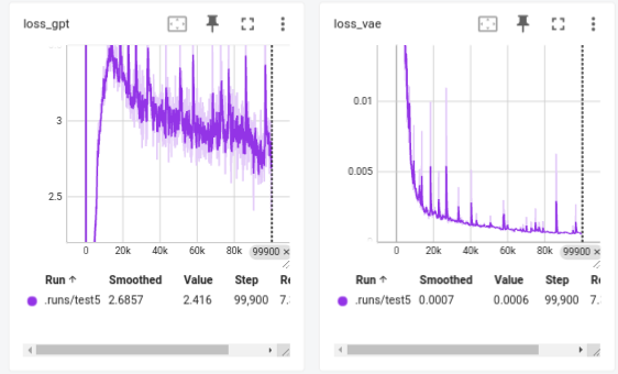After ~7h of training, it looks like we could train for a little bit longer but I’m going to begin with the visualization aspect in order to check what it has learned, and whether it already works as a game engine or not. Also, the GPT loss curve does some weird thing where it initially drops by quite a lot, then increases abruptly, and then it steadily goes down. My guess is that, as we’re jointly training both the VAE and GPT, initially the VAE may incorrectly model the images with a small number of vectors, which can then be easily modeled by GPT, hence the lower loss. Then, as the VAE learns to encode the images with a more diverse set of vectors, it becomes harder for GPT to model the sequence.